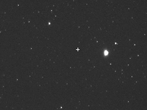 | Mit diesem Gerät werden bei Belichtungszeiten von 0,8 bzw. 2.4 Sekunden Sterne der 10. bzw. 11. Größe erreicht. Mit einer Sternkarte lässt sich die Position des Pols einwandfrei ermitteln (Kreuz). Der helle Bobbel rechts vom Pol ist natürlich der Polarstern. |