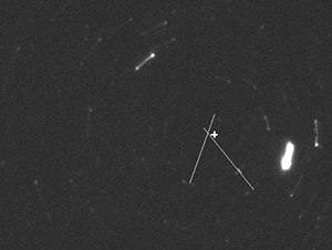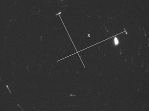 | Dann erhält man sowas wie eine Polstrichspuraufnahme. Den Drehpunkt kann man durch Tangentenkonstruktion ermitteln, wie hier gezeigt, oder aber mit großen Zoom die Sternbilder in der Gegend des Drehpunkts inspizieren. Im vorliegenden Fall sind wir noch etwas vom Pol (x) entfernt. |