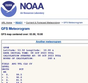 Ready: Meteogramme aus Reading. Die Daten des GFS-Modells werden u.a. als Meteogramme in Kurvenform ausgegeben. Die Bedienung erfordert einige Einarbeitung, die Aussagen sind aber recht relevant. Man muss geographische Breite und Länge im Eingangsmenü eingeben (also z.B. longitude 10.00 und latitude 53.50 für Hamburg). Als Modell für ein Meteogramm wählt man normalerweise „GFS-Model 0-84h“ aus. Im nachfolgenden Menü kann man Felder auswählen, also z.B. „Total Cloud Cover (SFC)“ aus. Beachten Sie: Dieses Modell wirft die Gesamtbewölkung aus – sehr sinnvoll für uns Astronomen. Nicht vergessen: „Choose from below“ anklicken. Ganz unten auf der Seite wird ein Passwort angezeigt, welches man eintippen muss. Dann erst wird der Kurvenverlauf angezeigt. Ähnlich kann man sich auch den Verlauf der Temperatur, Niederschlag, Wind usw. ausgeben lassen. Statt eines Meteogramms kann man auch Karten anzeigen lassen. Diese Seite funktioniert für weltweite Beobachtungsorte. Es wird alle 6 Stunden aktualisiert.